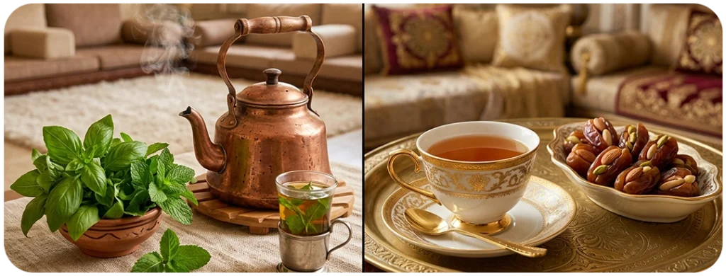 تكون الأجواء هنا مفعمة بالعفوية والدفء. يميل المضيف غالبًا لاستخدام أنواع الشاي السائب الذي يُحضّر على نار هادئة، مما يملأ المكان برائحة الشاي التقليدية. تمنح هذه الجلسات المضيف مساحة ليتفنن ويبدع في تحضير الشاي من خلال إضافة النعناع أو الحبق، أو حتى الزنجبيل والزعفران، مما يعزز من شعور الضيافة الحميمية.