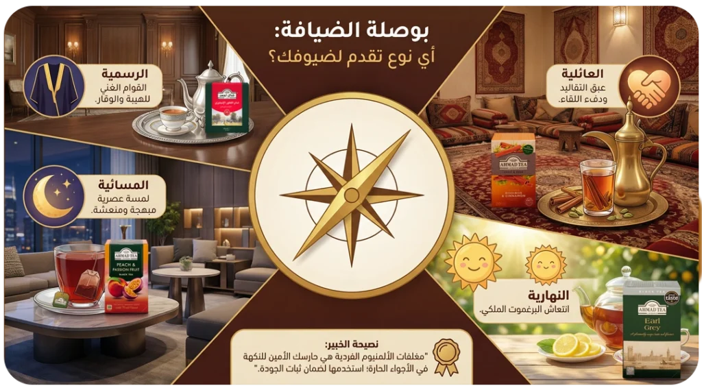 مع ذلك، أثبتت أكياس الشاي المغلفة جدارتها الفائقة كبديل فاخر وعملي، شريطة أن تكون من علامة تجارية عريقة وموثوقة تعتمد على معايير عالمية مدروسة في طريقة التغليف. في المملكة العربية السعودية، حيث تتسم البيئة بظروف مناخية قد تؤثر على الأوراق المكشوفة بمرور الوقت، يوفّر التغليف الفردي، وخاصة الذي يستخدم اغلفة الالمنيوم(الفويل)، حماية كاملة لزيوت الشاي الطيّارة، مما يضمن تقديم الكوب الأخير بنفس الكفاءة والنكهة العالية التي قُدِّم بها الكوب الأول، وهو أمر في غاية الأهمية للحفاظ على مستوى الضيافة في المجلس.