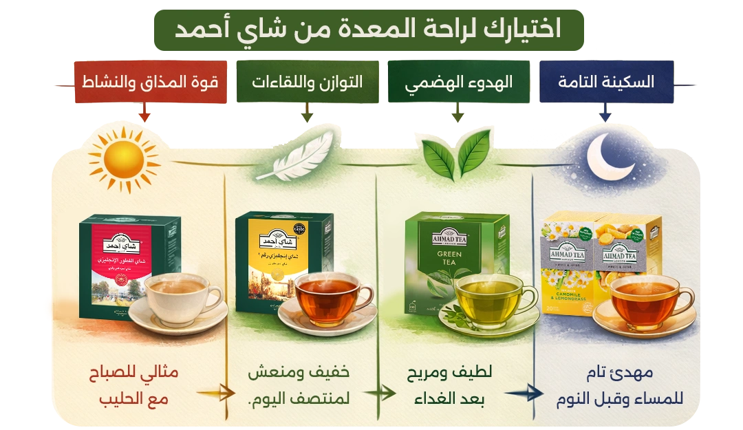 في المساء: في ختام يومك يقودك البحث عن شاي للمعدة الحساسة نحو الأنواع الخالية من الكافيين أو مشروبات الأعشاب الدافئة. هذه الخيارات تحافظ على طقس الكوب الدافئ ولكنها تترك جهازك الهضمي في حالة من السكون، مما يمهد الطريق لنوم عميق دون الخوف من الثقل أو الأرق.