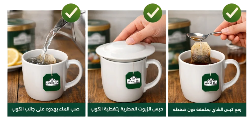 • [ ] صب الماء الساخن بلطف فوق الشاي وقم بتغطية الكوب للحفاظ على الزيوت الطيارة.
