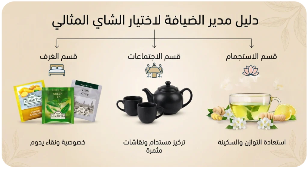 • لحظة وصول الضيف: يمثل الشاي رسالة ترحيب تهدئ من عناء السفر وتمنح الضيف شعورًا فوريًا بالاستقرار والانسجام مع مكانه الجديد.